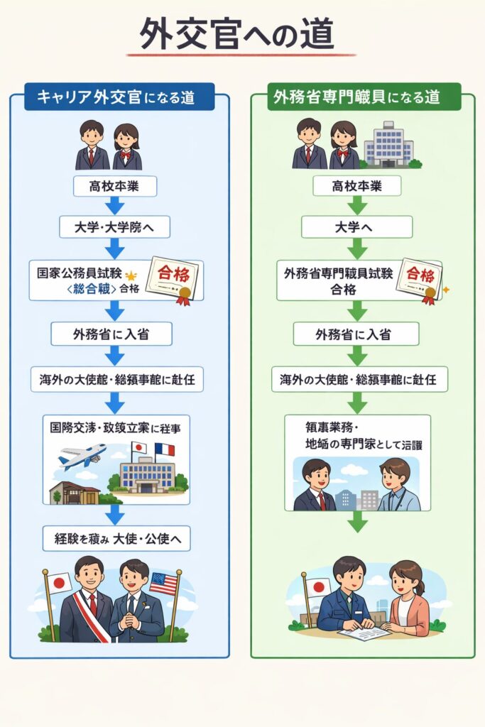 必要条件について・・・国家公務員採用試験に合格する必要がある。外交官にはキャリア外交官と外務省専門職員の2つのルートがある。