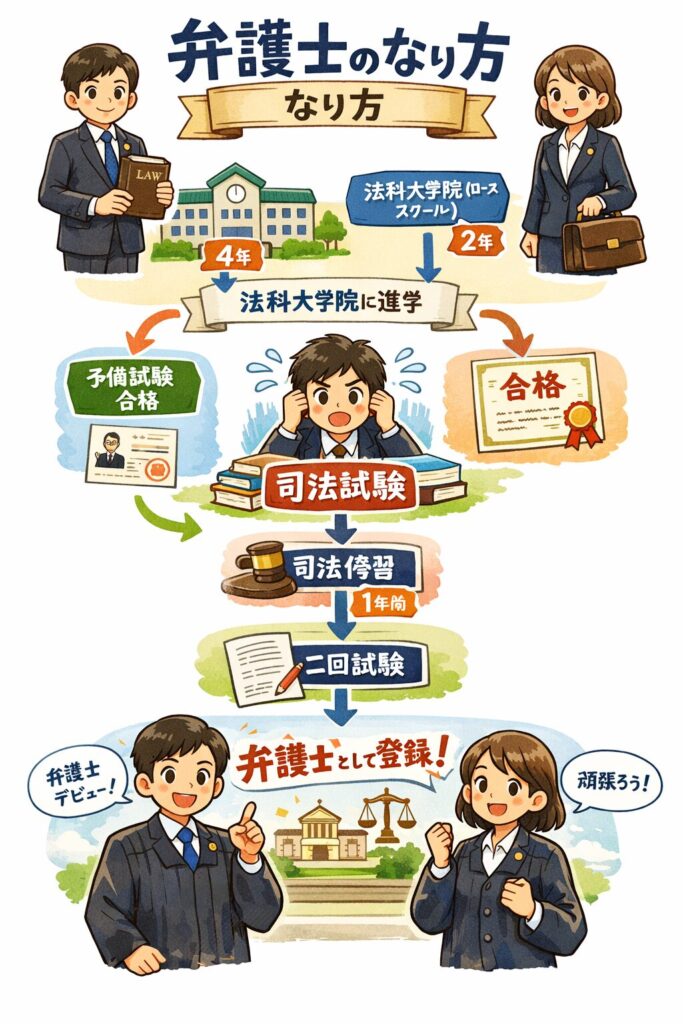高校→大学(法学部)→大学院(法科)→司法試験→司法修習(1年)→弁護士